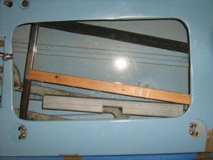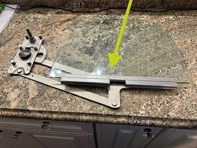 Fit the glass into its channel. The channel is 363 long ex Spridget, AHA7042, cut down. Glass is 470 wide. If the glass is equal-spaced in the channel, the wheels tend to fall out of the groove at rear at lowest window position. Space 48mm from rear, 59mm from front. Wheel track faces the outside of the door.