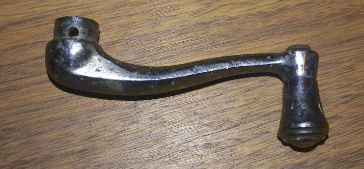 The die-cast pot metal knob is press fit on a steel swivel pin. Use a thin blade screwdriver to pry the knob away from the arm for removal. For the part in the pictures, this part will need to be cleaned and polished and re-chromed. There is also a thin metal thrust washer (not shown in picture) on the pin between the knob and crank arm.