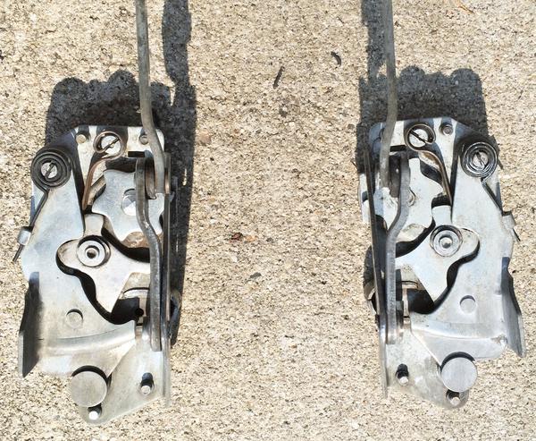 The first picture (below) shows one repaired and the other one not repaired showing that the rubber washer was missing. The second picture shows the door lock ends that did not need repairing. The third picture shows both mechanisms repaired where the rubber washers were missing.