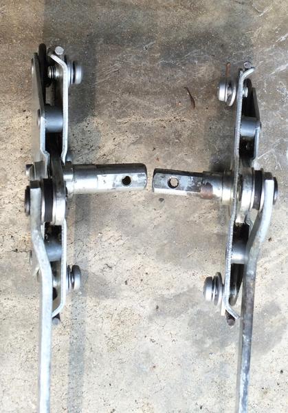 I received the shoulder rivets and was able to make them work. The original rivets' shoulders were 1/4" diameter with 3/8" heads. The ones I found have 5/16" shoulders with 3/8" heads. I had to drill the hole in the connecting bar to 5/16" and I bought new stainless steel washers to replace the very thin shim-type washers that were on either side of the original rubber washers.
