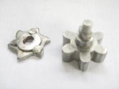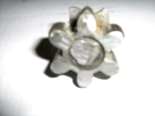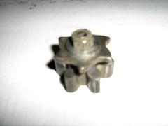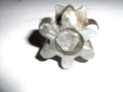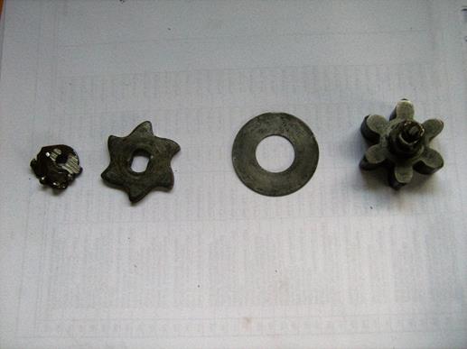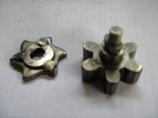 The earlier welded repair was hacksawed through and the components removed: the repair, hardened star wheel, hardened thrust washer and hardened pinion on its shaft are shown in the first picture below. The hardened components are believed to be case hardened. The star wheel was originally connected rotationally by a 9/32 AF double-D on the shaft and a mating one in the star wheel. There is a bearing for the shaft punch locked into the body of the latch.
