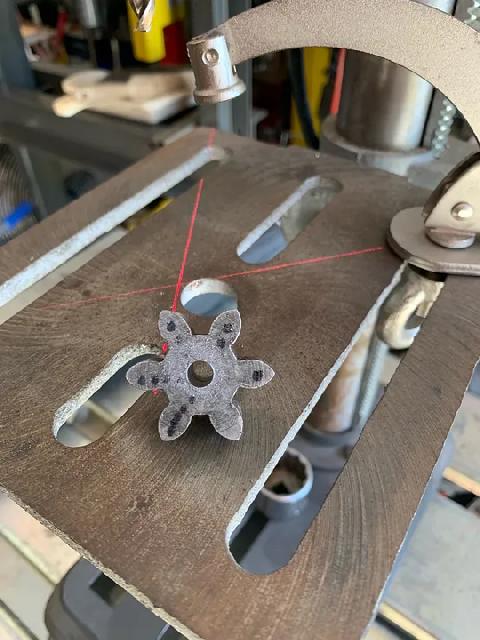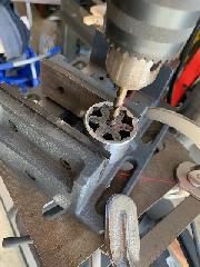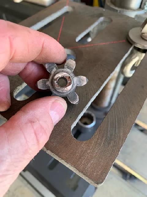 Here's how I drilled the hole in the pinion. The socket gave me 90* sides and machined flat surfaces. I scribed the pinion peaks and used center punch to mark the hole. I kept aligning the vise with the socket and pinion so that the drill press bit didn't drift when i lowered it. I put a slight mushroom cap on the welded shaft