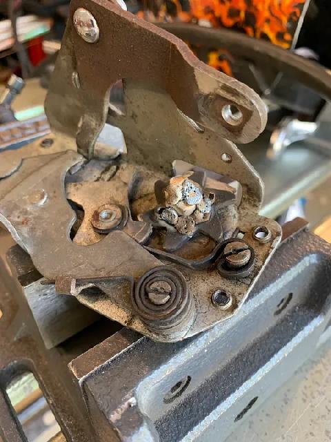 This star wheel repair was a little more difficult since I had to re-index the star wheel to the pinion gear. Where previously I welded the washer to the star wheel outside of the lock mechanism, with this lock I needed to see the star washer on the double D shaft before I obscured the view with the washer. Doing this inside the lock mechanism didn't give me much room for the TIG torch, so I decided to use the MIG welder. Less pretty welds, but you can really direct the moment or two of heat and wire. Not the prettiest of welds but its not going any where. pretty much the same methodology as the previous repair on the drivers side.
