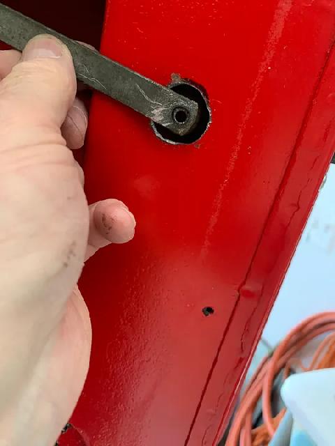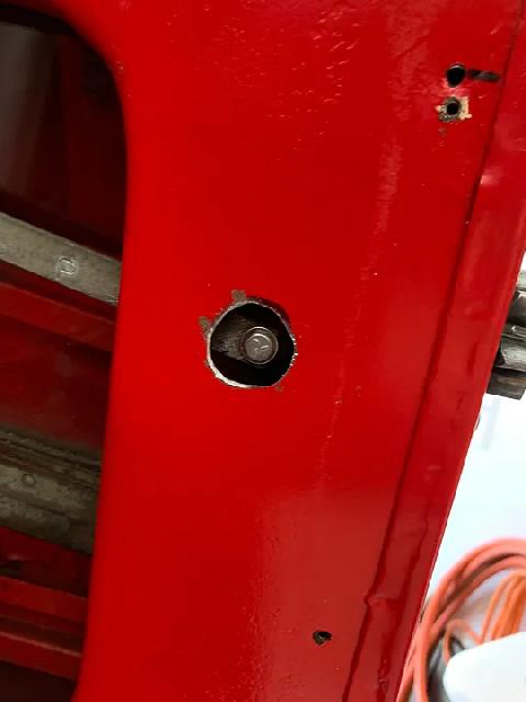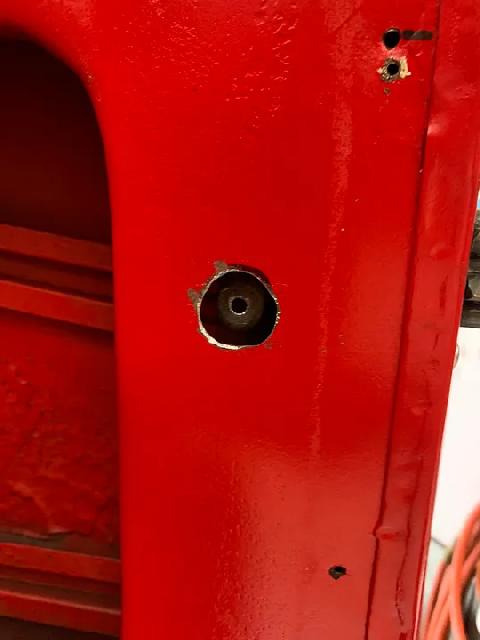 If you are a purist stop reading at this point. On the drivers side door the lever arm from the inside door release handle to the latch mechanism had a bolt where a rivet once was. Removing the nut and bolt let the latch mechanism come out really easily. This car still had the rivet which meant a lot of work to get the latch out. Two minutes with my reciprocating saw, and it no longer had the rivet. Add an access hole and you have a pretty easy way to get the latch mechanism in and out. And I mean super easy, less then a minute to get the latch/lock mechanism out once the lever arm bolt is removed. The rivet can be seen before I drilled it out, and that carriage bolt and nut was there and replaced an original rivet, I used Nyloc nuts for both spots.