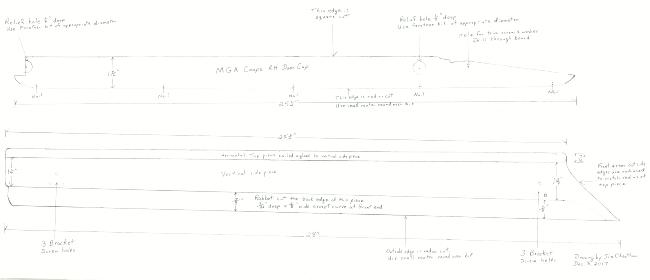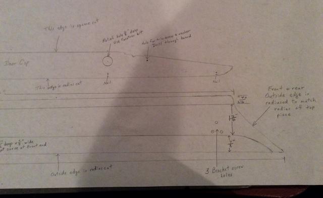 Since the door caps are mirror images of each other, this drawing should be able to be used for both RH and LH door caps. The drawing shows the bottom/back side of the RH door cap. For the LH door cap, the drawing would be of the top/outside except for the relief holes and the dado cut which of course are on the bottom/back side of both RH and LH door caps.