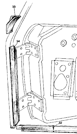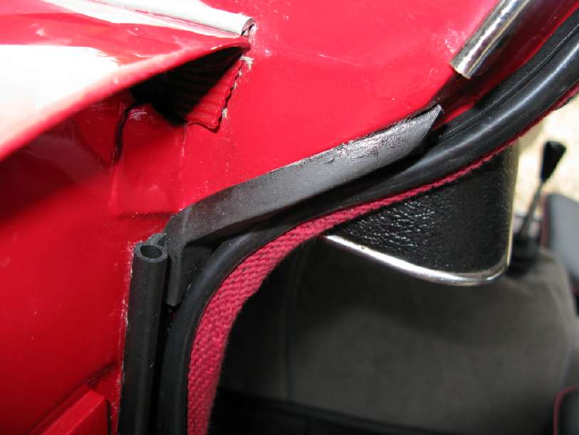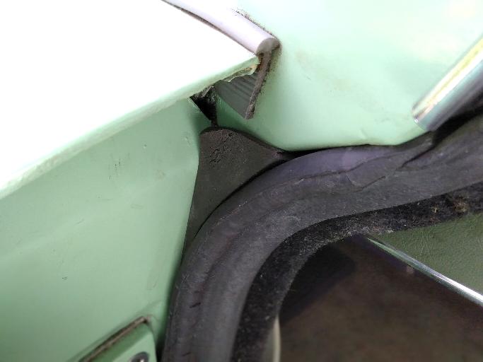 The Coupe has two additional pieces of seal along the front of the door opening. One is a molded crescent shape piece that goes at the body curve at top front corner of the door shell. This piece fits just forward of the main door seal. Photos above, supplied by Edward Vandyk in the UK, show remnants of this crescent seal on the right side door.