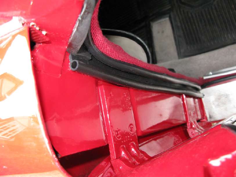 The other is a longer molded piece that runs from the crescent piece to bottom corner. This one fits just outboard of the main seal. If you look at the photo above right, the line left by the original seal is visible down the length of the door jam, parallel to the main seal. These two additional seals are glued in place, and together they seal the entire height of the steel door shell along the front edge, including intimate seal for the hinge wings. This should make the MGA Coupe a cozy and draft free cruiser.