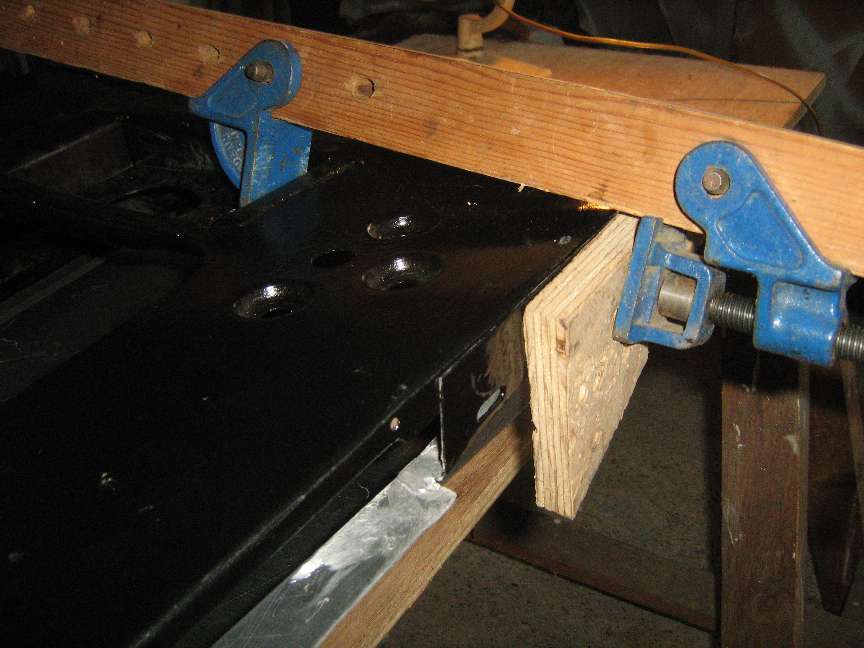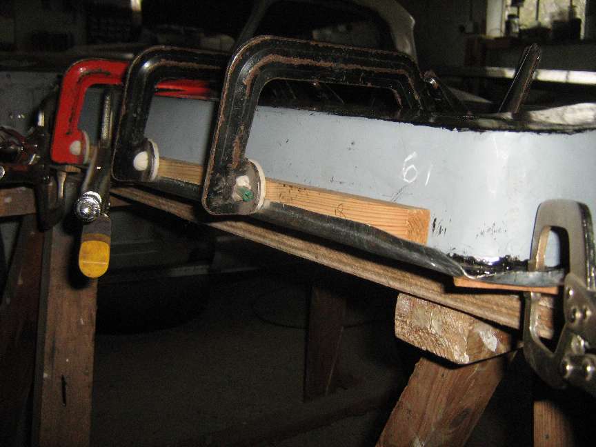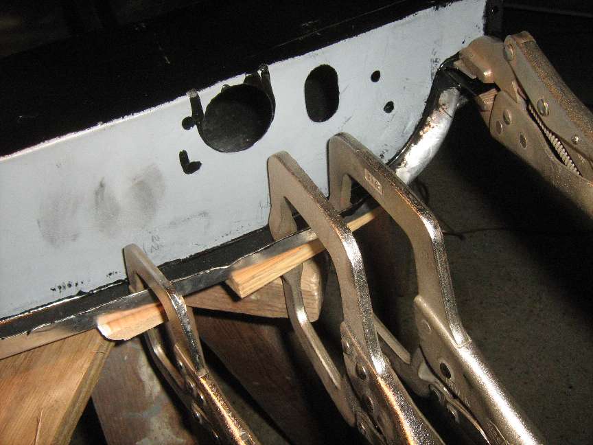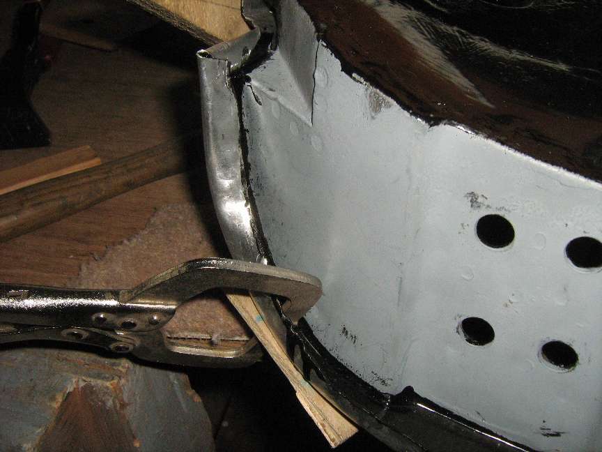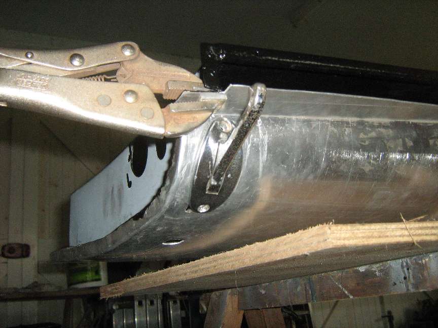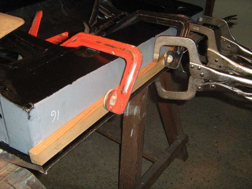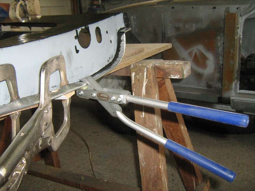 22. Working from front to rear, use 45 degree pliers (F273 from Moss) to turn a new fold-over and clamp to the door flange