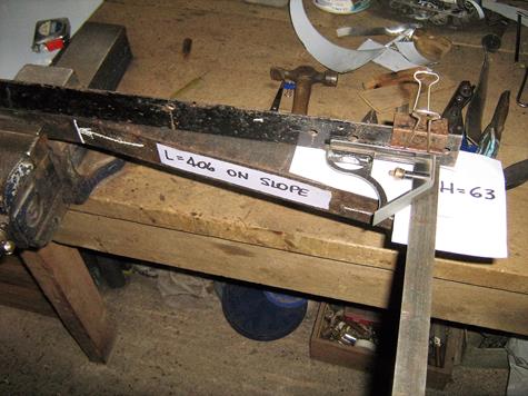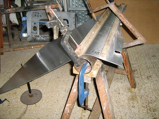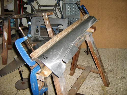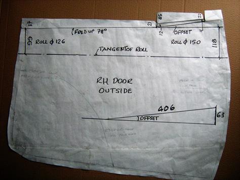 My first attempt did not fit the door frame because the offset angle for the cranked fold was incorrect. I cut off the previous fold and started again on the bottom of the sheet using a revised former with a slope length of 406mm and a height of 63 mm, as shown in the fifth picture above. These dimensions are arbitrary and just happened to be the actuals with the materials used, they have nothing to do with the dimensions of the skin.