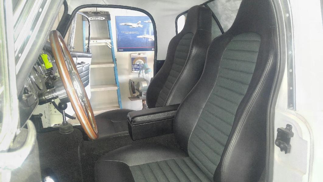 "Since this photo I built an arm rest for between the seats. It has a hinged top with padding. I did weld plates in the sides of the top support prior to installing the headliner for mounting the top link for a 3-pt seat belt system. It has a 7/16-14 thread (nut)".