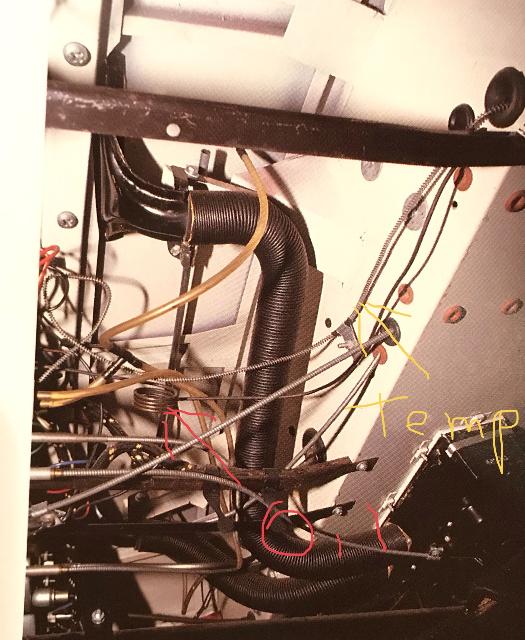 There was also considerable extra length to the sensor tube. On early 1500's there were additional coils above the heater shelf to store up the extra length. On later cars the additional coiling was done behind the dash, which makes the engine bay neater in appearance. I do not recall the production date for that change, but it is tradition to use the later configuration as the design is technically superseded. Photo below shows the two P-clips, top one holding the spiral wrapped temperature sensor tube, bottom one holding the oil pressure signal pipe.