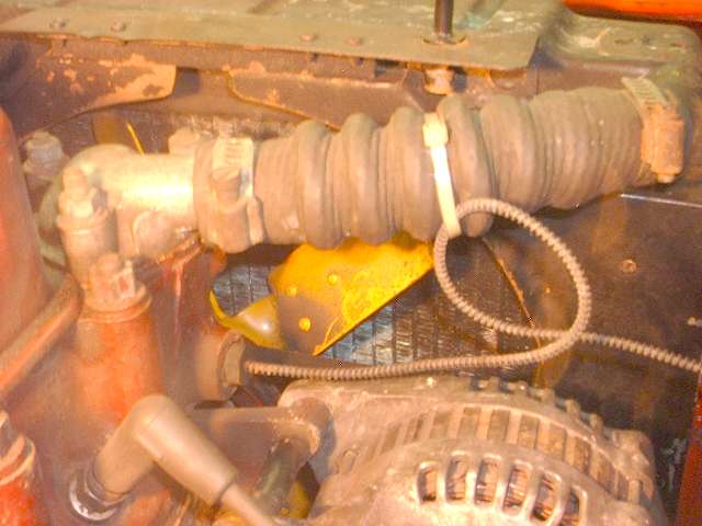 Since I drive a lot and do a fair amount of service on the engine, I take a different route with the tube. As long as it's not for concours show I prefer to run it along the inner fender. To do that you run it straight out from the sensor position above the generator and make a 360 degree vertical loop (about 2" diameter loop) about half way between engine and fender. This flex loop will see axial motion of the tube rather than lateral motion, but it still works well. I also tie wrap the tube to the upper radiator hose for strain relief and to keep it away from the generator (or alternator in my case). The tube then needs to be attached securely to the inner fender with another P-clip, preferably before it travels very far back. It is good to put a thin rubber liner or some tape between the tube and clip at this point to prevent chafing and possible cracking of the tube.