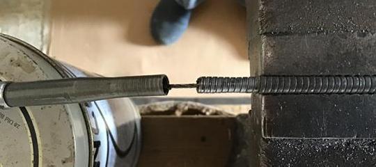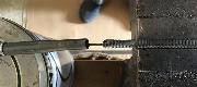 The sleeve is slid back and the trigger removed. In the second picture the crimps on the outer cable have been released by tapping the crimp, gently, with a hammer against the anvil of the vice, the outer is gripped in the vice and then unscrewed from the housing. Note that the outer is laid with a left hand thread so in this case the housing is turned to the right. In the third picture the outer is released, it was screwed in 5/8 up to the shoulder in its counterbore.
