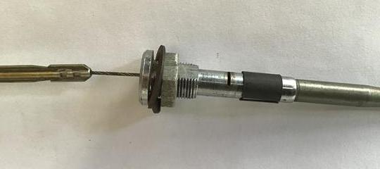 The first picture shows the complete assembly with the knob withdrawn to show the detent dogs. The split, black spring steel sleeve in the second picture retains the detent trigger in its slot. Slide the sleeve away from the bezel thread to access the trigger, twist the choke knob to lift the trigger, remove it and keep it somewhere safe. The third picture shows the outer cable inserted in the body, the chalk mark is on one of two crimps which retain the outer in the body.