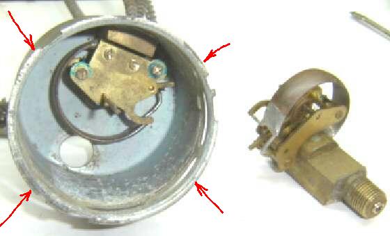 James Cameron in California, USA, was doing some refurbishment work on the dash and wanted to remove the dash assembly without pulling the safety gauge out of the car. He was wondering if it was possible to remove the front trim ring (and glass), then push the gauge body back through the hole in the dash. Initially the answer is "no", because the gauge shell is a close fit in the hole, and the shell has a small flange on the front edge to key with the front bezel (red arrows below). However, where there's a will there's a way.