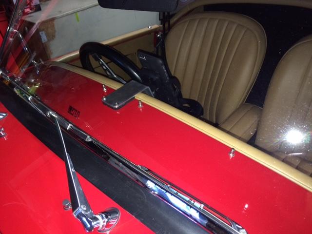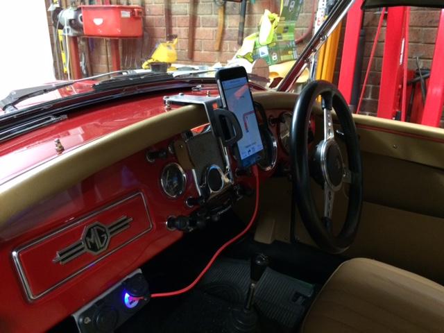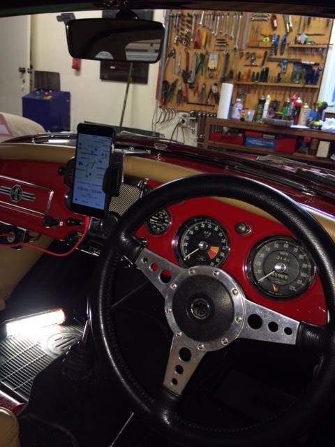 On 4/12/2015, Mike Ellsmore wrote: "A problem that has been bugging me is where best to mount a GPS/cell phone in an MGA. I didn't want something down low on drive tunnel or stuck on the windscreen that would block the view. Because I have fitted a spare wheel holder on the boot, the standard MGA rear view mirror was useless so I removed it and replaced it with a suction cup held mirror high on the windscreen. This left me with a spot to fix a bracket for my cell phone/GPS. It is made from 50 mm x 3 mm aluminium strip 140 mm long, bent at the 90 mm mark (105 degree included angle) - with (2) 3/16" dia holes, 10 mm in from one end (1 5/8" between centres to match rear view mirror fixing holes) and a 4 mm dia hole in 10 mm at the other end to suit a cell phone holder I bought at a local shop. You can use any holder by bolting it to the bracket - mine uses a single M4 bolt. Only bending the bracket to 105 degrees sets the screen at the same slope as the A dash - if you don't want to use the ball joint at the back of the holder to angle the screen.