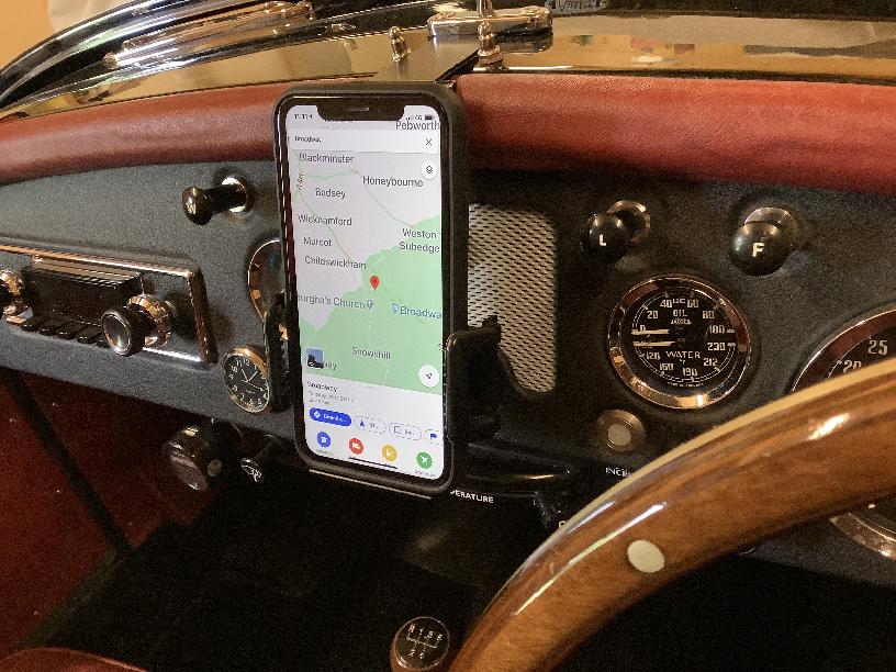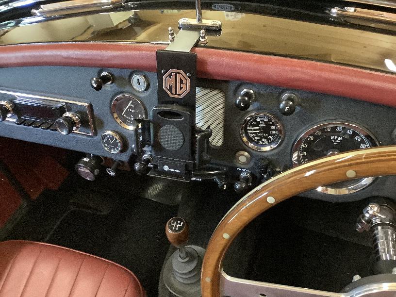 "Re: your article on mounting a mobile phone holder. I had a similar mount on my MGA but found I could not fasten down the tonneau cover on the passenger side when driving alone in cold weather. Also I could not hear the sat nav instructions very clearly from the iPhone. I decided to fit a blue tooth radio and play the sound through two speakers in the foot well and at the same time made a new bracket which is longer and allows the phone to be below the padded dash strip. The MG badge kills the black bracket". -- Mike Storey