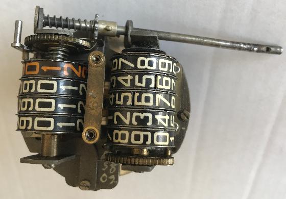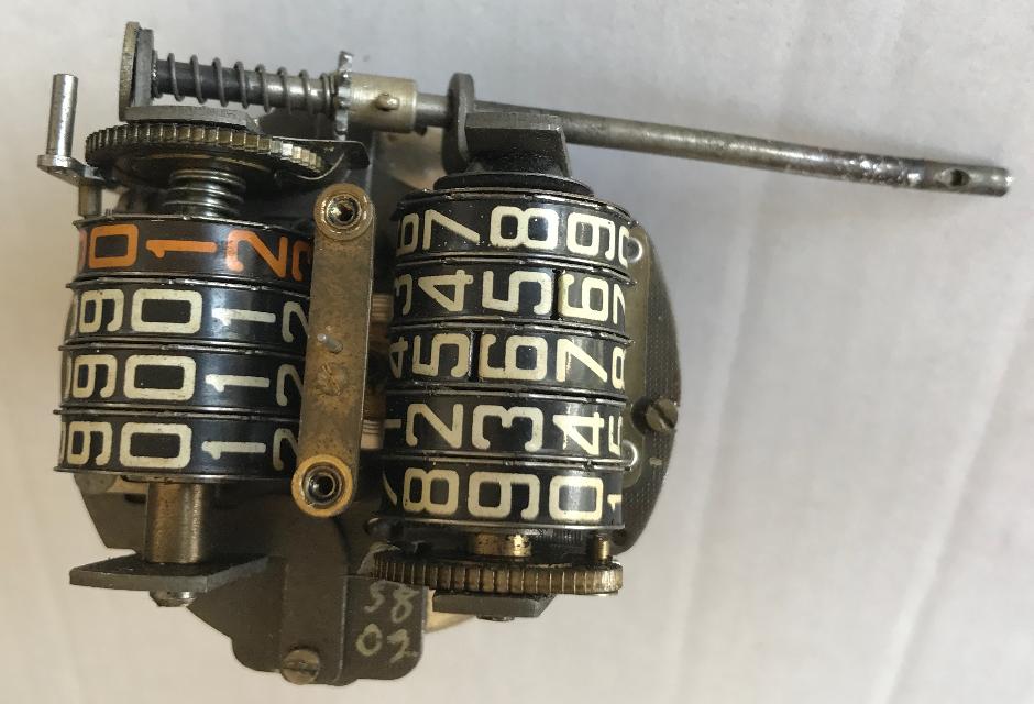 In between the number wheels of the odometer are friction disks that will turn the next wheel in line. Each of the number wheels has a driven disk with ten ratchet type teeth on the input side, and a small spring finger catches on to those teeth to prevent rotation of the wheel (except of the first wheel being driven by the input ratchet gear). Each of the number wheels also has a disk with one ratchet type tooth on the output side of the wheel, with the ramp of this tooth being reversed from the orientation of the teeth on the input side of the wheel. As the number wheel completes each rotation, the tooth on the output side of the wheel lifts the spring finger to release the next wheel in line so it is free to rotate, and the next wheel will then advance 1/10 turn (one digit) to where it will again catch a tooth on the spring finger and be stopped and held in place. Each number wheel in turn drives the next wheel in line to affect the sequential stepping of the odometer. The main odometer does not have the 1/10 mile number wheel, but it does have the one tooth disk that will trip the first number wheel for each mile of travel.