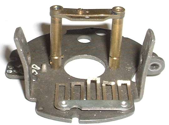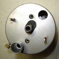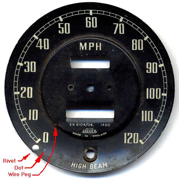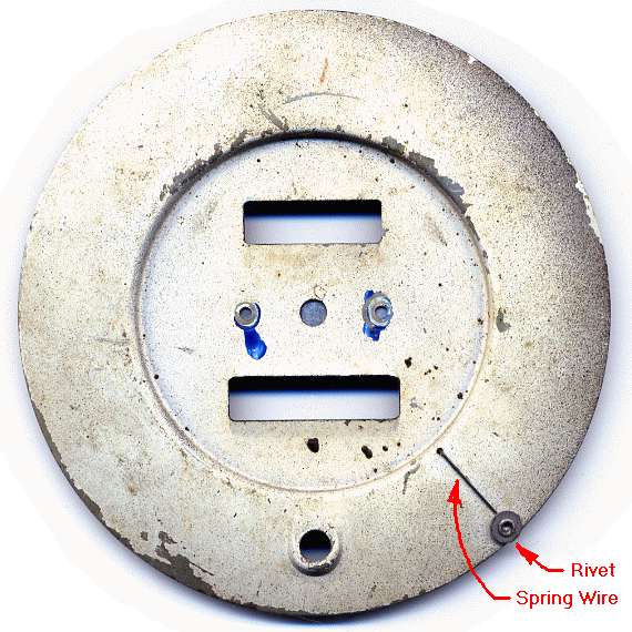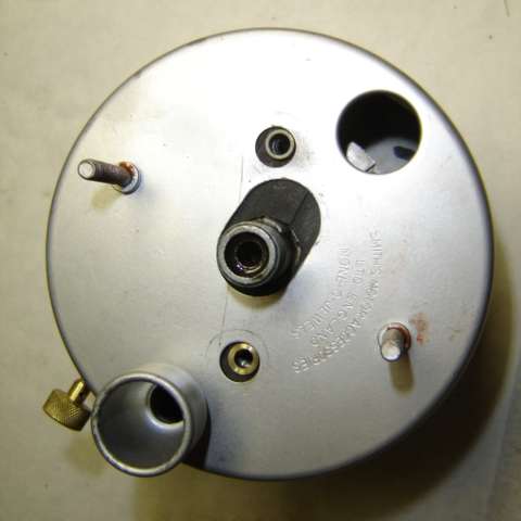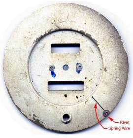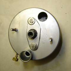 When it is time to reassemble, install the works in the case first with screws in back of the housing. Then install the face pate with two screws. To get the needle in correct orientation, hold the instrument upright, and position the needle to point at the small white dot just below the "0" point on the face plate, and press the needle firmly onto the shaft. Then depress the spring wire zero peg, swing the needle upward past the peg, and release the peg wire to spring back forward. The needle will then come to rest gently against the peg.