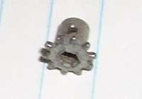 I was told the little gear in the picture above is upside down, which it is, but that's not the problem. Apparently there are some variations on this design. The input shaft shown is straight and plain on top so the shaft can be pulled out of the gear. Some others may have a flange cold headed at top end of the shaft so the shaft will not pull out the bottom even after removing the split pin. One person has reported removing the split pin, then moving the obstructing reset arm a bit to one side, and then pushing the shaft upward enough to allow removal from the case. I have another report of a Smiths speedometer (possibly a little newer issue) having a molded nylon reset gear. This was secured to the shaft by a press fit straight steel pin, flush at both ends.