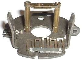 There is a metal bar behind the faceplate running between the two screw locations, otherwise no other physical support behind the faceplate. If you would devise a lever or a puller, the only good place to apply pressure to the face plate is on the screws. The metal bar is composed of a thin brass bar in front of a thicker steel bar, and one small screw just off center. The screw is used to pull the two bars together, bending the thinner brass bar slightly in the process. This is the adjustment to minimize end float in the output shaft. Do not pry against the faceplate in between the screws, as this might damage the bearing support for the output shaft.