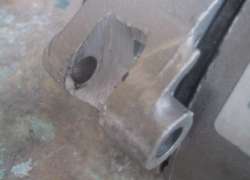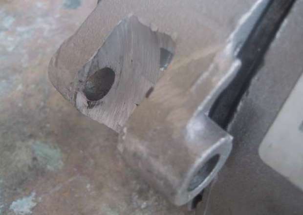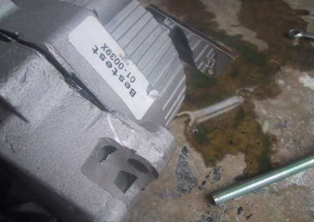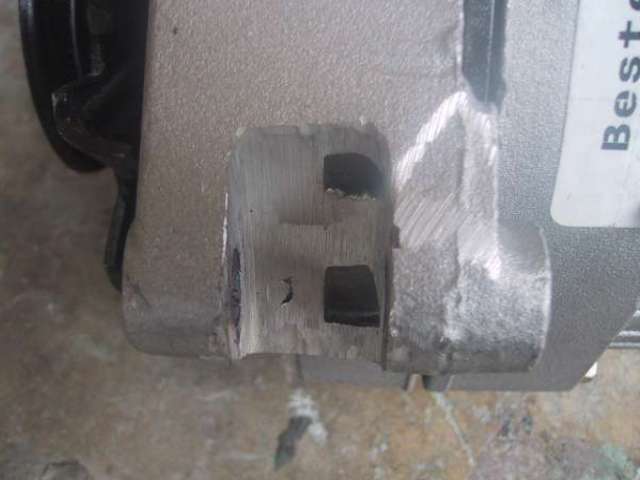 Because most of the weight of the alternator is biased toward its front, I decided to use the wide flange for my upper attachment. To fit it to the water pump mounting ear, I ground out a slot in the upper flange. This took about 10 minutes with my angle grinder. The slot is .5 inches aft of the face of the alternator and .7 inches wide. This allows the alternator pulley to line up just right with the fan pulley and the damper. I was careful not to cut the slot too wide because I wanted the through bolt to clamp the new double flange around the ear that extends from the water pump. If the slot were too wide, shims would be in order. I started out with the slot a little too narrow, progressively widening it and test fitting it around the water pump ear. Here are some pics of the slot in the alternator:
