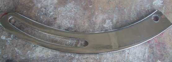 I used a J-Bracket (Mr. Gasket Part # 9851 – about $ 11) for my lower adjustment arm. I cut it to a length of 8” and drilled a 3/8” hole near the end. This hole is drilled slightly off center in order to give the bracket as much room as possible to clear the fan on the front of the alternator. I did not have to do any bending of the bracket. It just clears the fan near the adjusting bolt by a few millimeters.