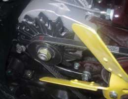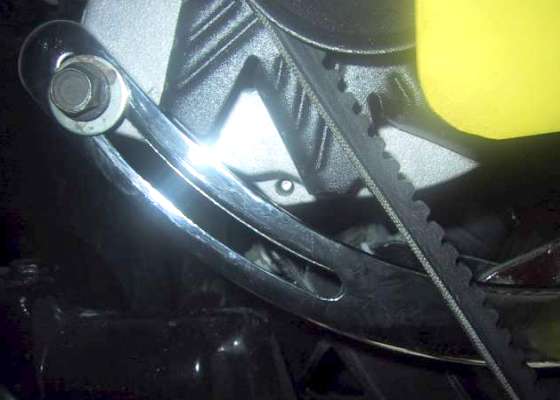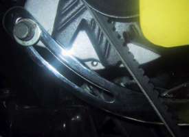 The alternator was easily mounted with a 2.5 inch 3/8” bolt and Nyloc at the front, and a 5/16” bolt at the back. The J-bracket was attached to the mounting point with the 8mm bolt. I used a 37” V-belt which gave me a snug fit with about 1 inch of remaining adjustment. Here are a few shots of the final installation which feels quite rigid to me once everything is tightened down: