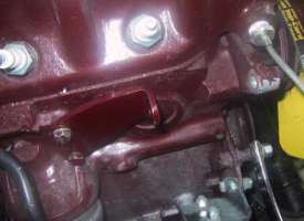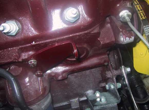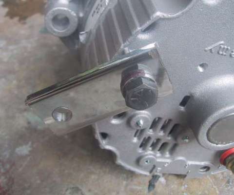 In order to support the alternator at the back, I used the alternator mounting bracket from an MG midget (about $ 10 – used). I also used the threaded mounting hole on the back of the alternator to hold a small bracket that I created from the remaining end of the J-bracket. I drilled two 5/16” holes in this short piece of plate so that the hole in the ear lined up with the front mount. As it turned out, this added ear slipped in right behind the ear of the Midget mounting bracket without using shims or spacers.