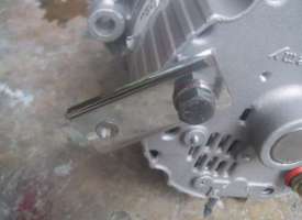 Because the wide flange has a 3/8” hole, I had to enlarge the hole in the water pump bracket to 3/8”. Hanging the alternator in this fashion gave me a very sturdy upper attachment point and allowed me to use the (lower) threaded flange as it was intended. Strangely, although there is an attachment bolt hole in the back of the alternator that is 5/16-24, the threads for the adjustment bolt are 8 mm-1.25 pitch. Likewise, I think the power output nut is also metric. I used a 10 mm wrench to tighten it.