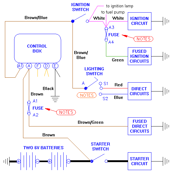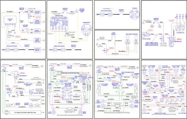 Shown below is the MGA primary electrical load diagram. The control box is part of the charging circuit. That box and each of the five boxes at the right have a link to an expanded view of those circuits. Additionally there is wire color code and trouble-shooting information on a previous page. From here you may step through all of the wiring diagrams in sequence by picking the green arrows at the bottom of each page.