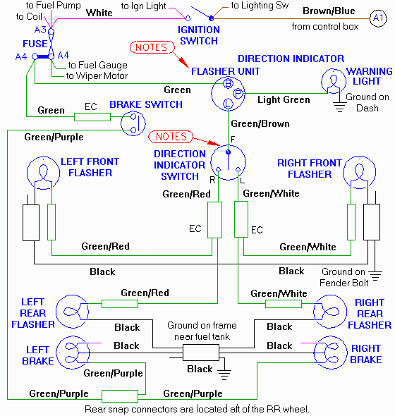 Shown below is more of the MGA fused ignition circuit diagram. This page shows the brake light and turn signal circuits for the MGA 1600. This model uses separate bulbs for the brake light and rear turn signal, so it has a simpler circuit than the 1500 and does not use the relay box. Snap connectors labeled EC are in the engine compartment near the starter switch.