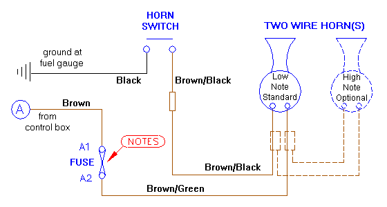 NOTE: The short length of Brown/Black wire near the horn switch is part of the dash harness. The longer length is part of the main harness. The snap connector here is the only connection in the dash harness that is not connected to something in the dash assembly.