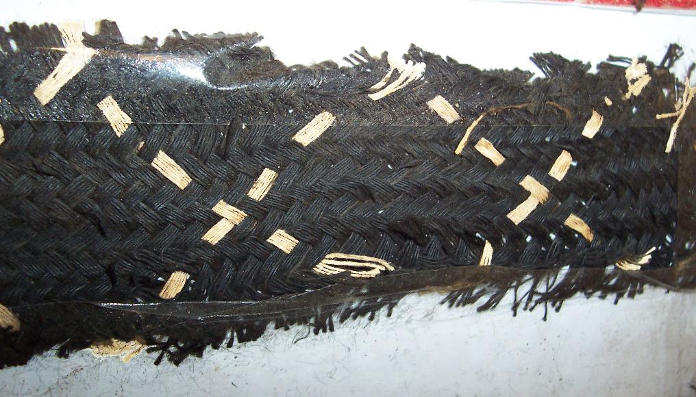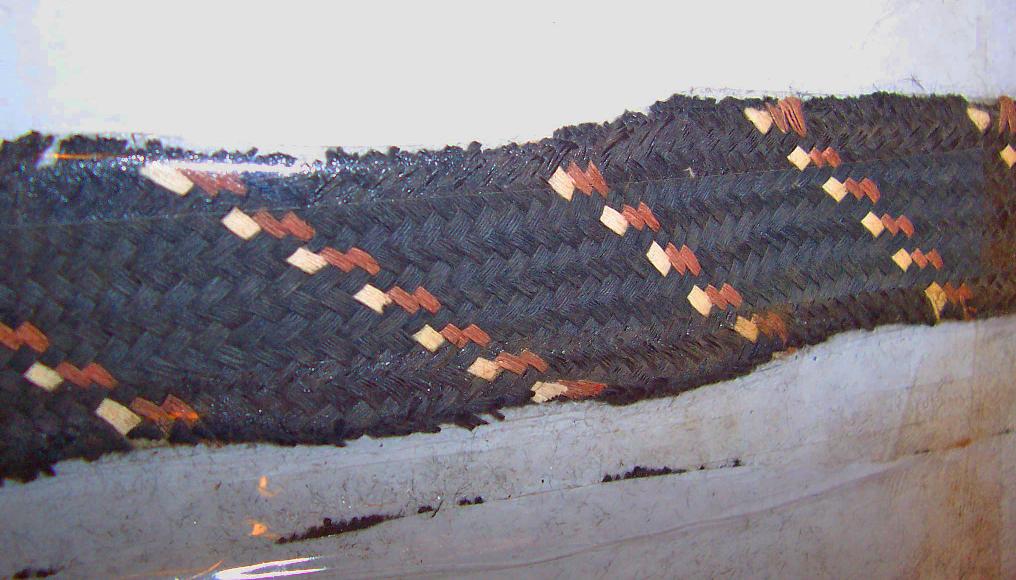 Notice in close up pictures the braid consists of six side by side threads. Each braid is woven over two other braids, then under two other braids. This makes the colored dashes to be rectangular. The color patterns repeat every 12 braids. This might be 1 color braid and 11 black braids, or 3 color braids and 9 black braids. The color braids are commonly referred to as stripes. So the picture on the left shows one white stripe and two red stripes with the pattern repeating every 12 braids.