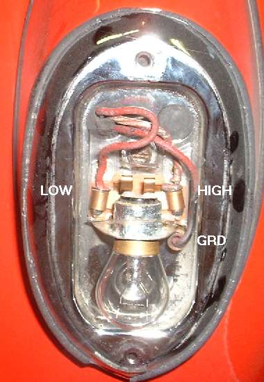 The front parking lamp (side light) should have three wires (as original). Some replacement parts may have only two wires and may or may not reliably ground on the body of the car. The black ground wire should connect to a tubular receptacle on the side of the lamp socket. When (if) the black wire is supplied with the lamp, the wire might be soldered to the lamp base, or it may have a bullet terminal inserted into a tubular receptacle on the lamp base. If there is no black grounding wire with the replacement lamp, you may add and terminate this wire using the same tubular connector that is used for the rear lamps (if the tubular receptacle is part of the lamp base).