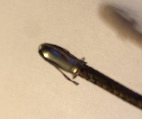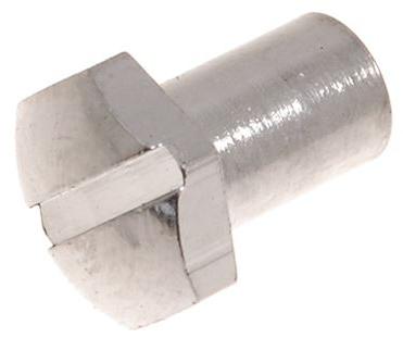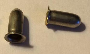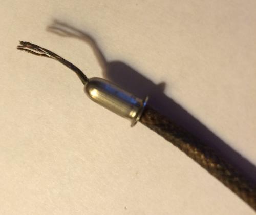 These terminal sleeves are 0.184 diameter and 0.403 long with a flange 0.25 diameter (to stop them falling thru the rather sloppy sockets on the lamp base). Material is plated or tinned brass 0.017 thick. Advantage of this type wire terminal is that you can push the insulated wire through a very small hole (molded, drilled or poked) in the rubber base gasket, then install the wire terminal without need for crimping or soldering. Original method of termination is to strip the insulation back 1/4-inch, push the wire through the tube until the bare wire extends out the end while insulated part of the wire is pushed fully into the tube. Then flare out the wire strands, and bend them back over the outside of the tube before inserting the assembly into the tubular receptacle in the lamp base.