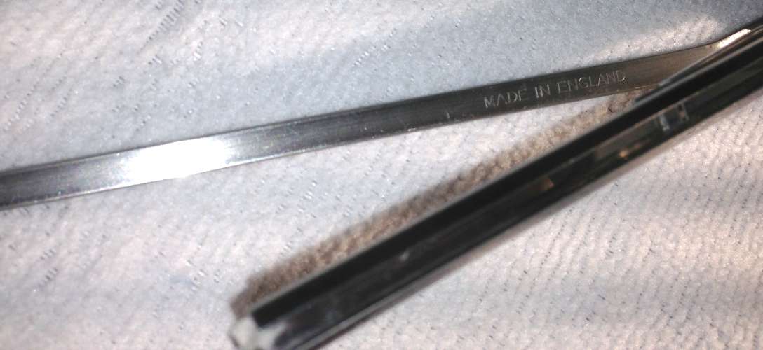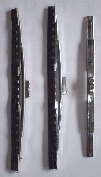 Trico replacement refills for the Trico round back blades. Note, suitable for the original MGA blades. The Trico are painted steel backed and designed to snap off to the required length. (like a utility knife blade). -- A packet of replacement rubber blades bought at Cannington swap for a dollar. They have flat back and work well in original MGA arms. -- Notes from 20 years ago.