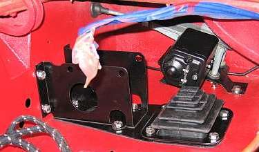 The wiper motor is not only tucked under the body cowling, but is also located aft of the air scoop for the cowl vent. For a left hand drive car, the master cylinder and pushrods and the top ends of the pedals definitely interfere enough to prevent removal of the wiper motor. The solution is to pull the clevis pins, remove the pushrods, remove the pedal excluder (metal ring and boot), remove the pedal pivot bolt, and drop the pedals out of the way. (You may need some assistance to hold the pedals in place for later reassembly).