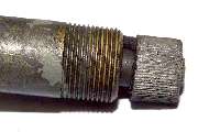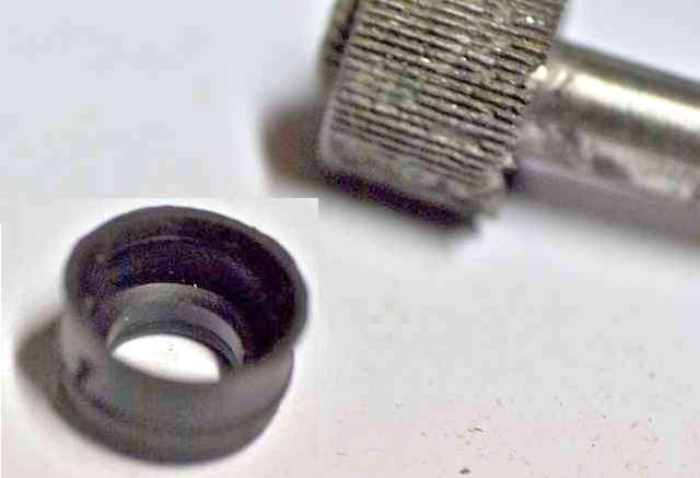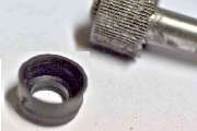 These pictures show the parts to be assembled, the seal area after assembly, and the finished part. Again, a press is handy to to put the sprocket back on the shaft. This is where you need to install the sprocket back in original position either by measurement or by using the thin flat washer as a pushing tool. The seal fits over the pilot end of the housing and fits loosely inside of the knurled knob (similar to an engine valve seal). You should still be able to turn the spindle with your fingers. During final assembly in the car, grease the drive cable and maybe put a light smear of grease on the sprocket as well.
