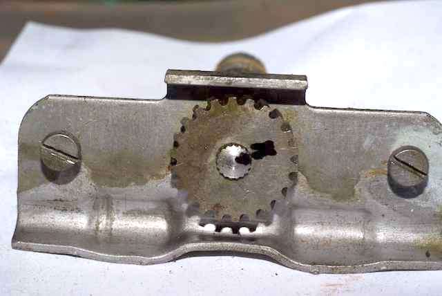 In the first picture you can see an ink mark on the sprocket and end of spindle. This is just a precautionary step. The press fit spline should be symmetrical all around, but it might reassemble easier if it was put back in the original position. The second picture shows the seal area between the output knurl and the end of the housing. This one has no seal or only small fragments of rubber remaining. The third picture above shows what remains of the better seal of the two. Don't expect too much of a 50 year old rubber part.
