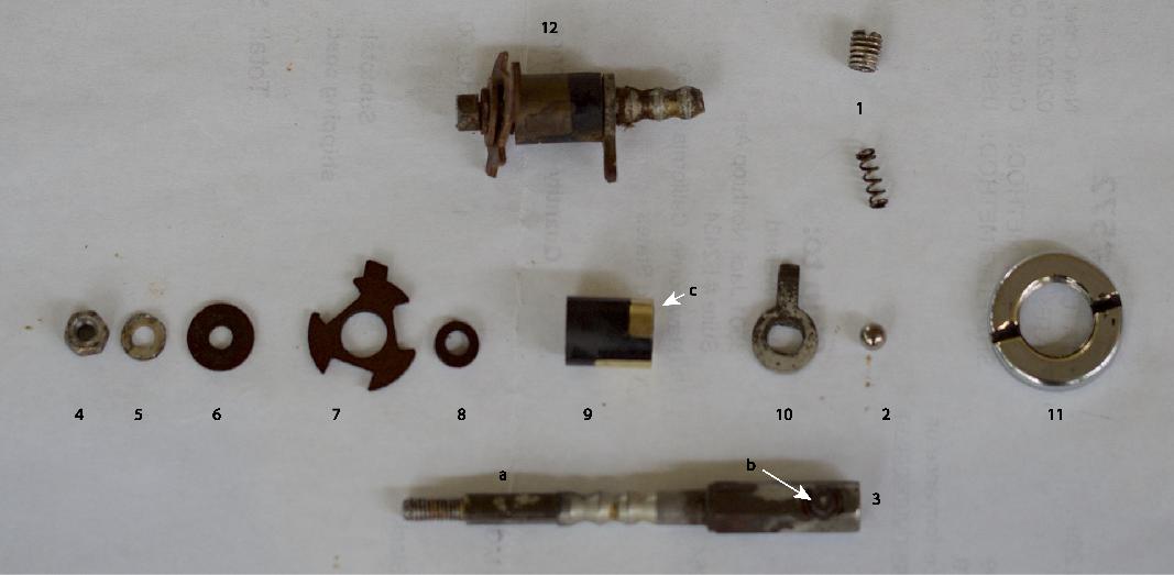The contacts can be repaired/cleaned as required and reassembly is the reverse procedure, as they say in the manuals. The assembled components are shown at (12) on a broken shaft.