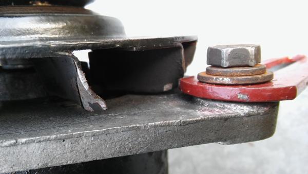 "This old CCM bicycle repair tool fit the square fan pulley mounting block, and being thin enough to fit between the inside pulley face and the fan, made loosening the front mounting nut a breeze".