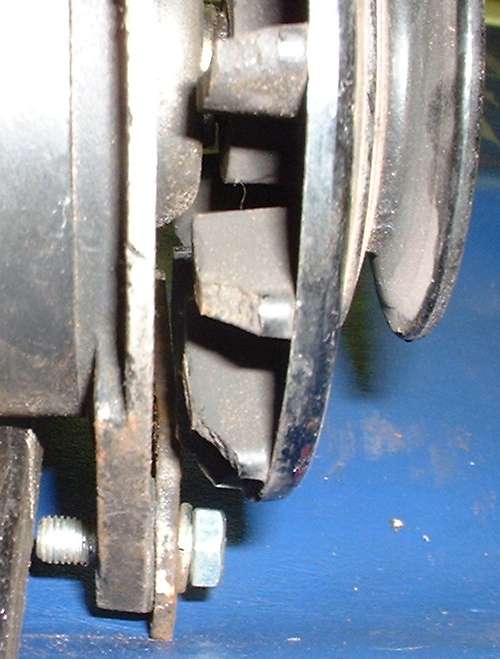 Notice the iron TC pulley sits closer to the fan than the sheet metal PR pulley.