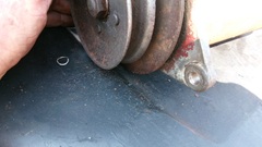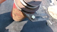 Then position the generator roughly in place,with the link slipped onto the pedestal stud, and install the large flat washer and lockwasher and self-locking nut loosely. But a self-locking nut (prevailing torque lock nut) is a PITA, because you can't spin it up with your fingers, having to wrench it, and wrench it, and wrench it,and wrench it, all the while in the confined space. So you may find it easier to use a lockwasher and standard flat nut. Spin those fasteners up to take out the slack. Then position the generator and install the top two bolts loosely (longer bolt at front) with bolt heads in front, lock-washers and hex nuts in back, and spin those up to take out he slack. From this point on it is good to have an extra pair of hands (helper).