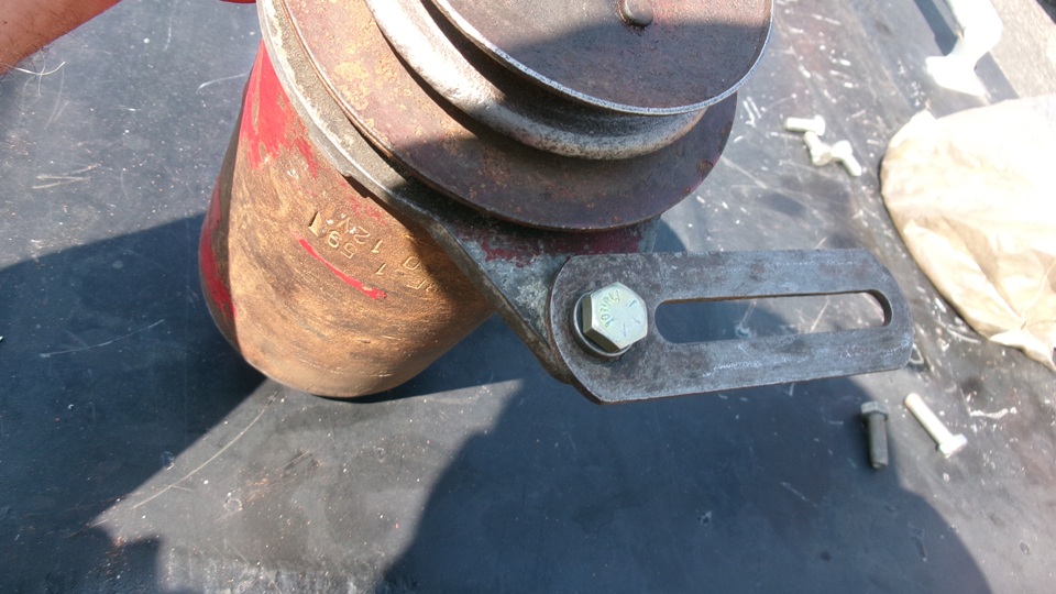 Once the larger adjuster nut is tight with correct belt tension, you can relax and remove the pry bar. Then snug up the other fasteners. Even then the smaller link bolt directly below the pulley is a tough reach with a wrench, and you may drop that tool a few times as well.