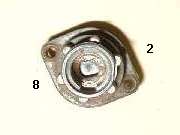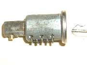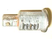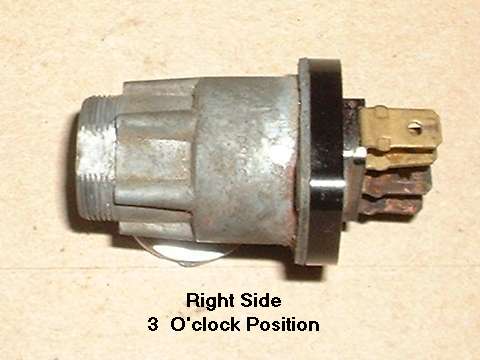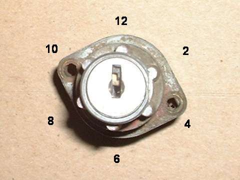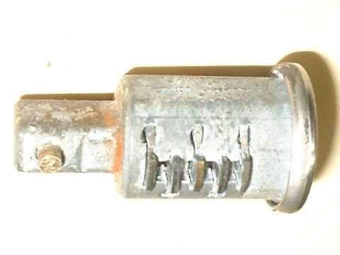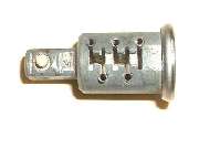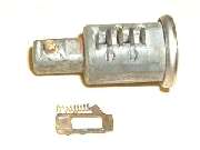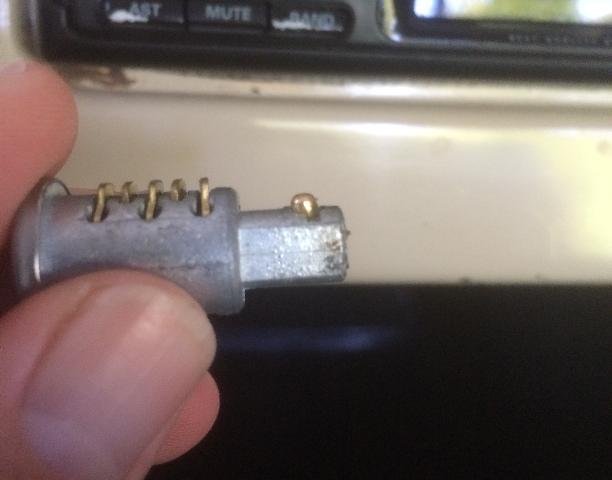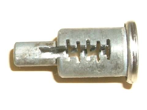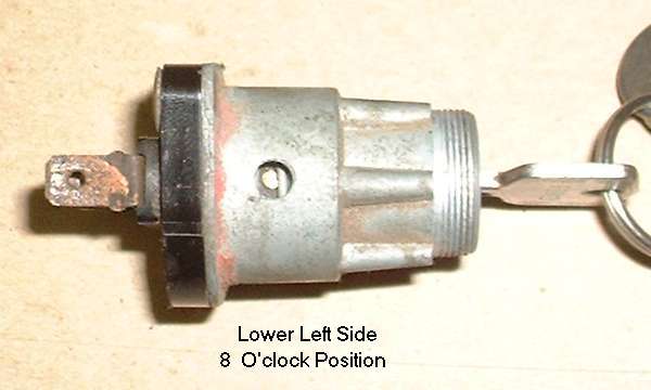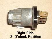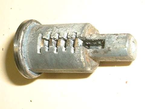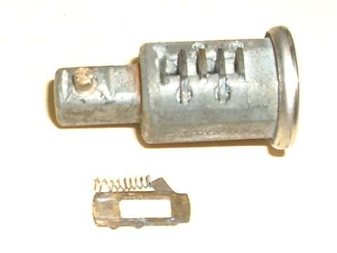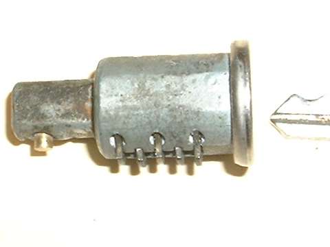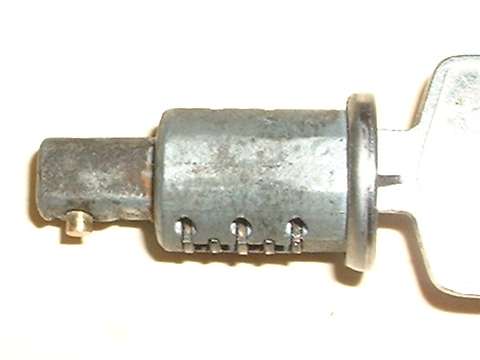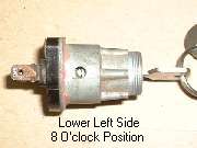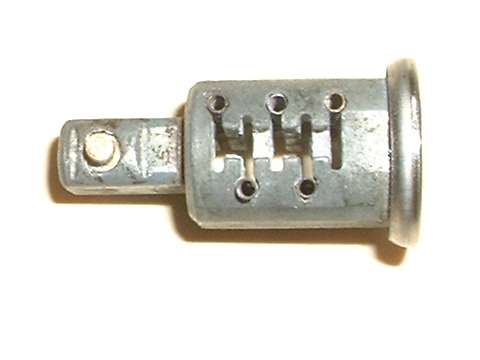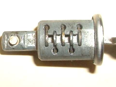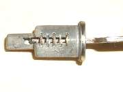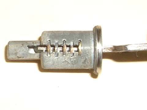in line with bottom edge of key when in the "on" position. Inside the hole, looking between coils of a spring wire, find a brass button about 0.084" (2.13-mm) diameter. Using a probe like a fat paper clip or thin Phillips screwdriver, press this spring loaded pin in while you pull the key and drum out of the switch housing. A new switch should come apart easily. An old switch might be a tough pull if the double-D nose of the drum is stuck in the switch rotor.