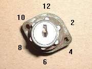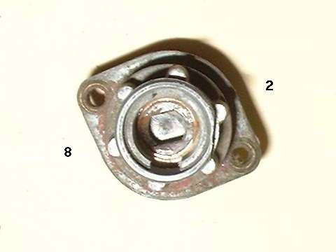Photos above, left to right: Switch rotor with double-D hole in "on" position at 2 o'clock rotation. Switch rotor in "off" position at 12 o'clock rotation. Inside switch housing showing small bottom hole in rotor that accepts the brass locking pin.
