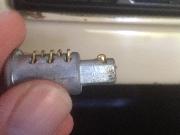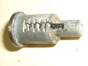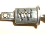 Photos above, left to right: Left side of cylinder assembly with key removed, all tumblers extended downward where they will lock into the slot in the housing. Bottom of cylinder with key removed showing tumblers lowered, also showing three of the five spring pockets. Top of cylinder with key removed and tumblers lowered.