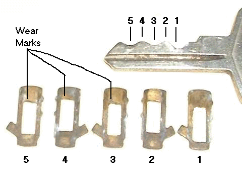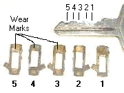 This is a 5-tumbler lock, so the numbers in picture at left represent the 5 stations on the key and the 5 matching tumblers. Notice the wear marks where teeth on the key bear against the apertures in the tumblers. The key also wears down some with use. This makes the tumblers drop slightly below the bottom of the cylinder where they might hang up in the slot of the housing. If you have to fiddle a bit with your key to get the lock to turn, this may be the problem.