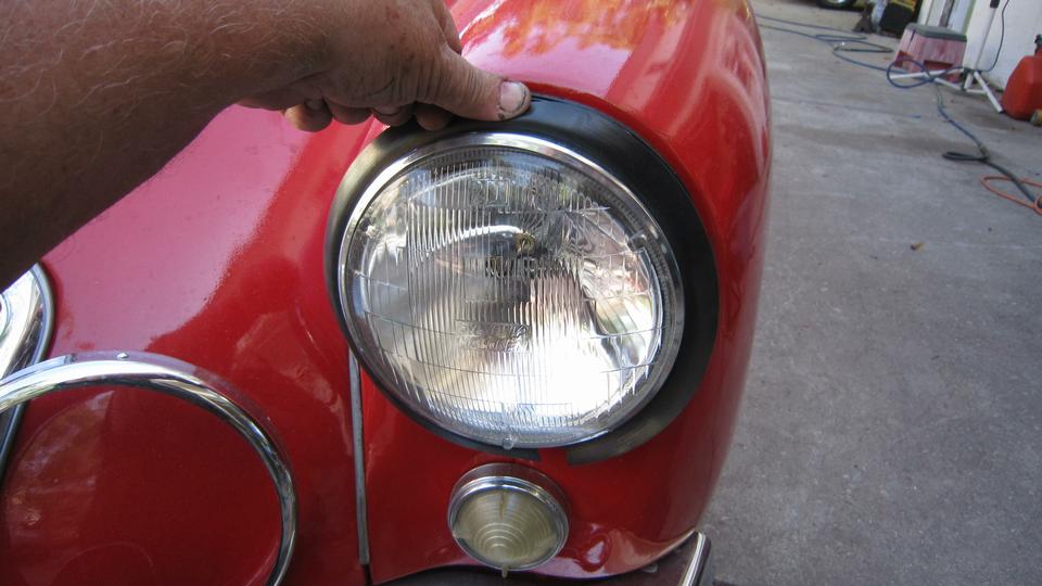 When the headlight assembly is installed, there is a rubber gasket between the fixed bucket and the front wing. This gasket may be a bit thicker at the exposed edge, where it will be visible from the side before the trim ring is installed. Ideally the trim ring should seat against the rubber gasket to avoid contact with the paint.